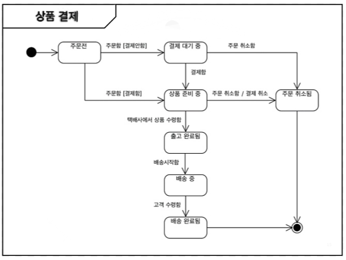 | 전이 | - 객체의 상태가 다른 상태로 변경되는 상태 - 화살표로 표현 |