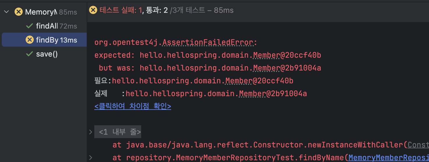 - findAll() 부분에서 이미 객체 "member1" 과 "member2"를 이미 save해버려서 findByName()에서는 다른 객체를 불러오게 됨 !! ⟹ error