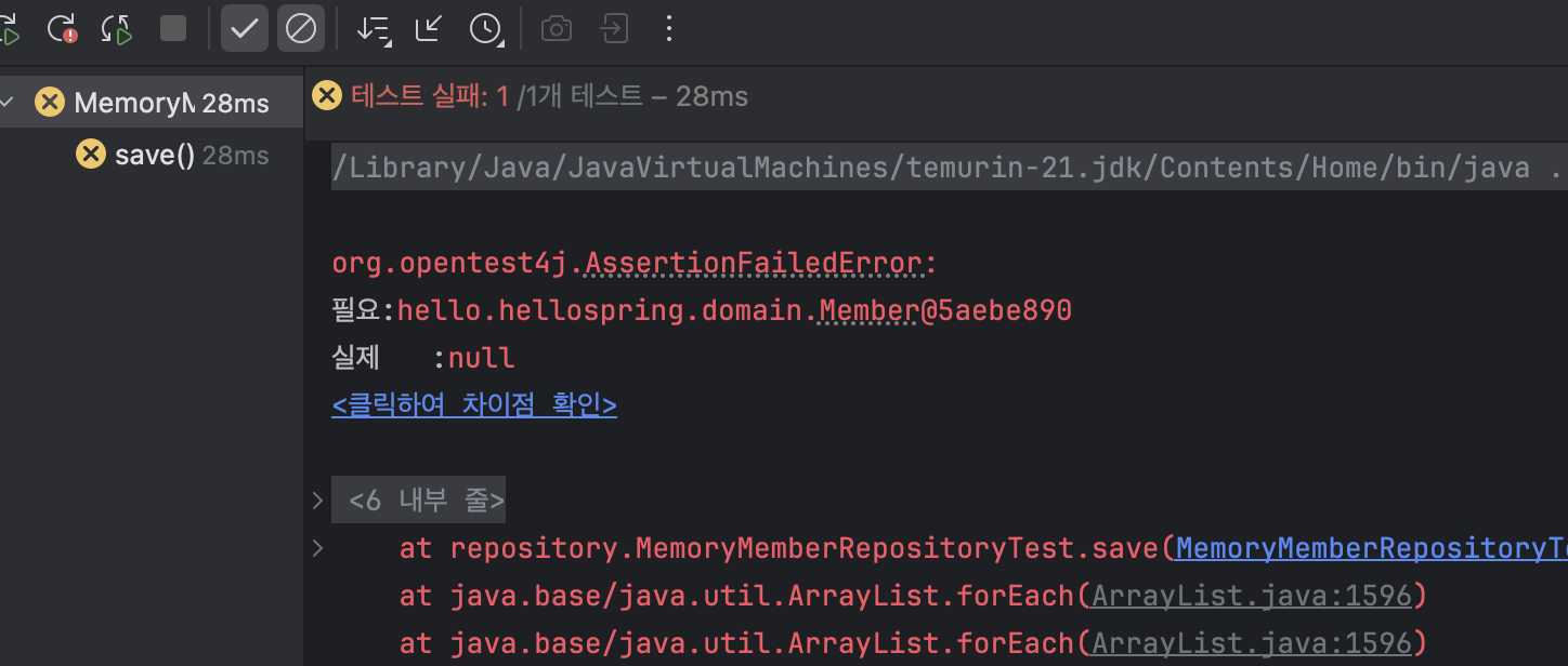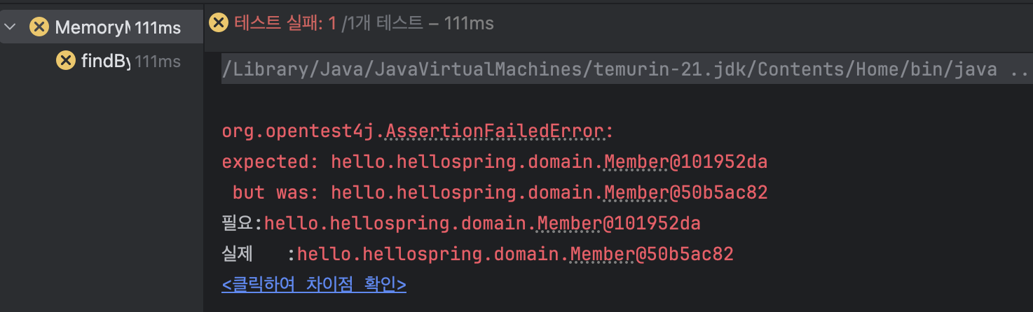 - spring2 != member1 (spring2 는 memebr2) 이므로 테스트 실패 !