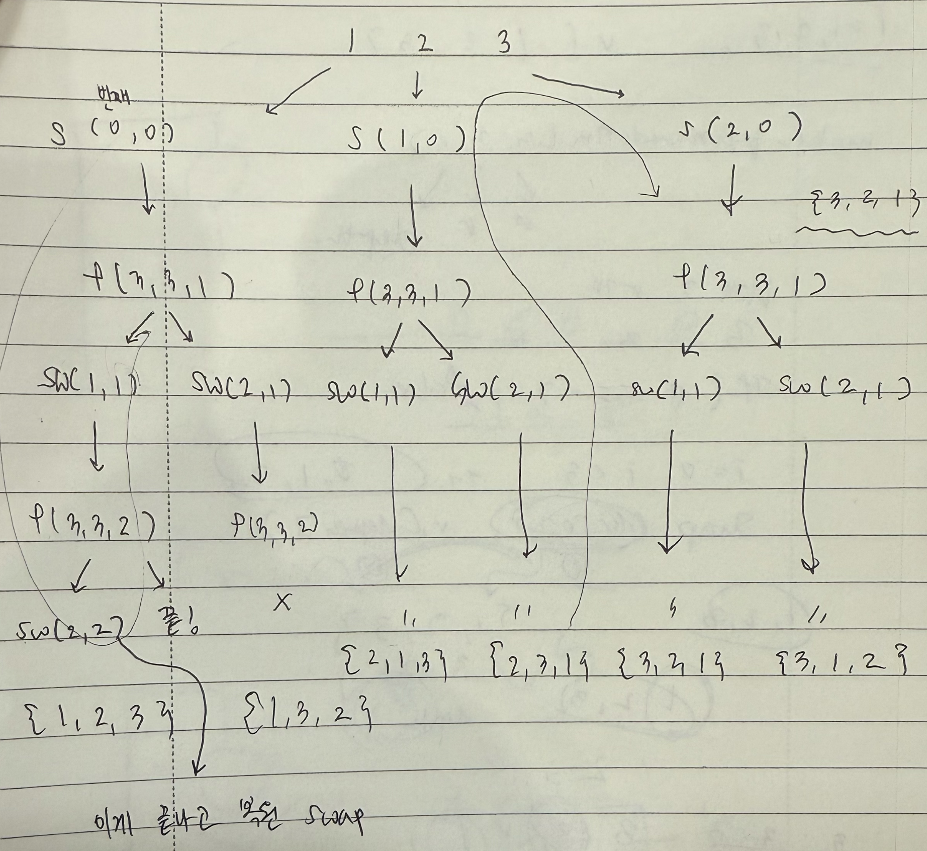🎈 코드 예시#include using namespace std;vector v;void printV(vector &v){ for (int i = 0; i 매개변수:n: 입력 데이터의 크기 (벡터 v의 길이)r: 선택할 개수 (여기서는 3개)depth: 현재 생성 중인 순열의 깊이 (재귀 깊이)작동 원리:종료 조건:r == depth: 선택할 개수만큼 선택한 경우(현재 순열 완성) printV(v)를 호출하여 순열을 출력하고 종료재귀 호출:반복문으로 현재 depth부터 n까지 순회하며 swap을 사용하여 요소의 순서를 변경순열을 하나씩 생성한 뒤, 다시 원래 순서를 복원(백트래킹).swap을 두 번 해주는 이유ex) {1,2,3}에서 swap하여 새로운 순열 {1,3,2}를 생성하고 makePe..